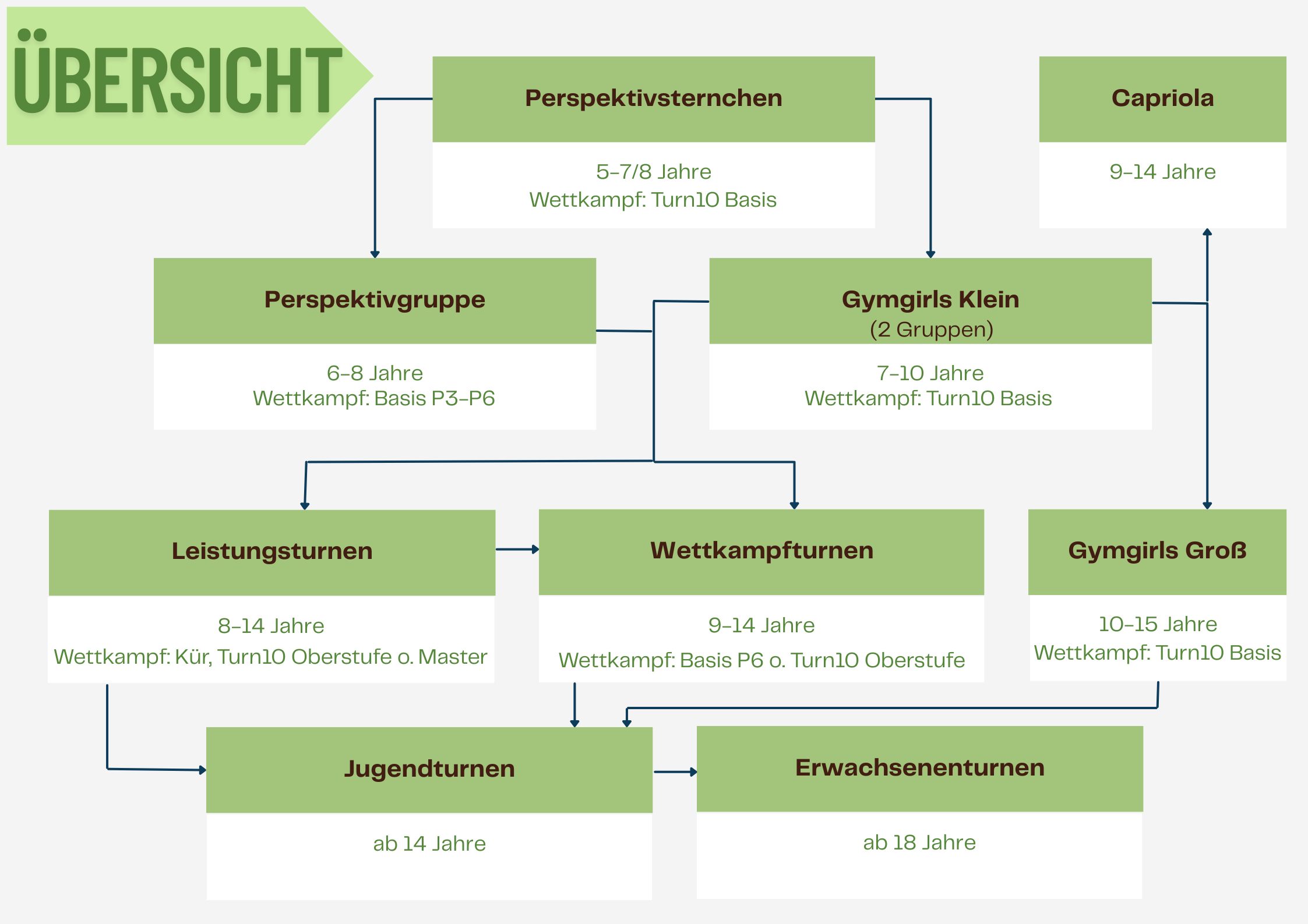 Die Gruppen richten sich an Teilnehmende im Alter von 4 Jahren bis hin zum Erwachsenenalter, die die Grundlagen des Turnens an allen vier Geräten (Boden, Sprung, Reck und Schwebebalken) und darüber hinaus vermittelt bekommen möchten. Die Orienetierung der Gruppen liegt zum Einen in Richtung Wettkampfturnen und damit dem Üben von ganzen Turnübungen. Zum Anderen liegt die Ausrichtung in Show und Auftritt, was mit Elementen aus der Akrobatik verbunden werden kann.