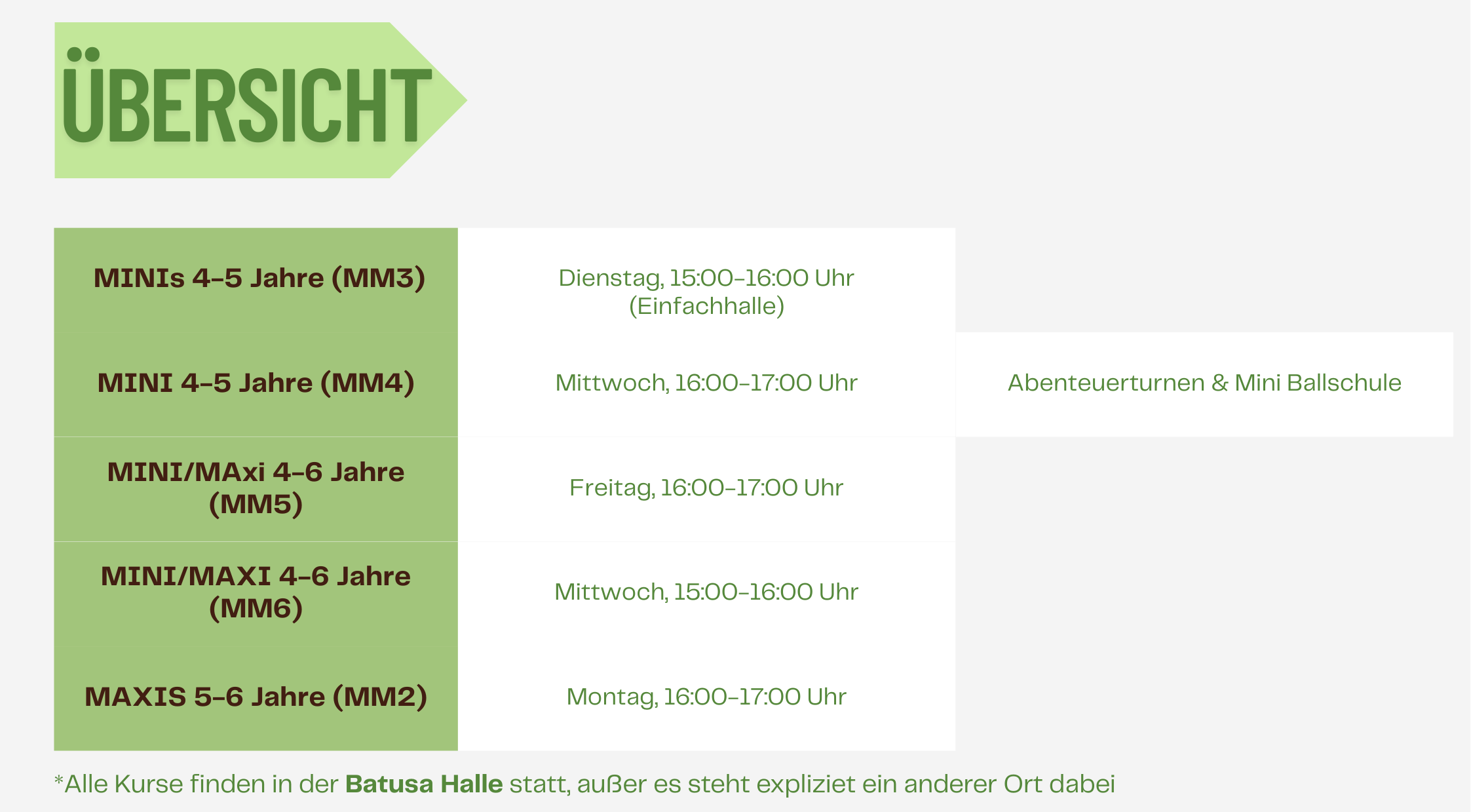 Unsere MINIs ab 4 Jahren erkunden die Bewegungslandschaften in der Gruppe und das schon ganz ohne erwachsene Begleitung. Die 5-6-jährigen heißen wir bei den MAXIS willkommen.