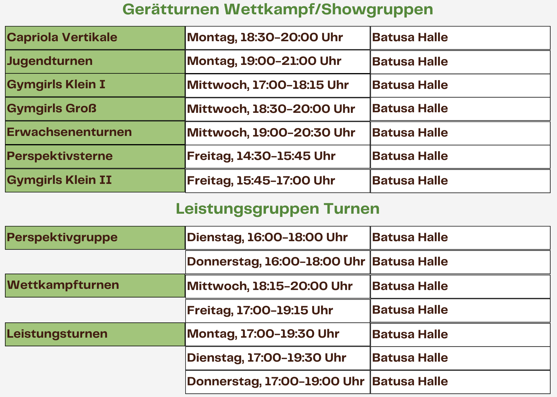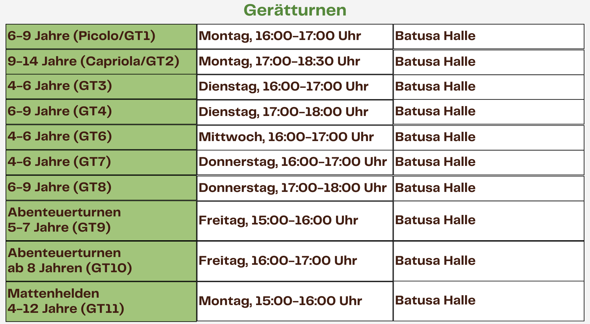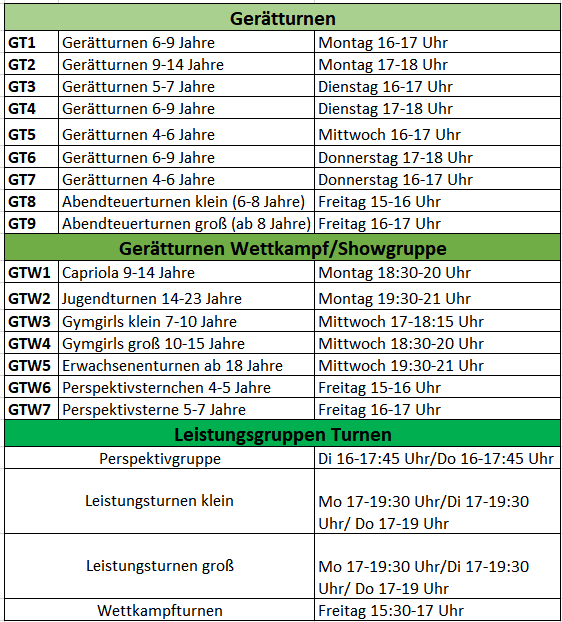 Wir helfen gerne bei der Wahl der richtigen Gruppe. Bitte senden Sie uns eine Mail an geraetturnen@tus-holzkirchen.de mit Informationen zum Alter, dem Leistungsstand und der gewünschten Ausrichtung der Gruppe (Wettkampf oder Freizeit).