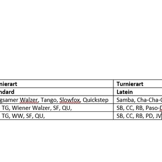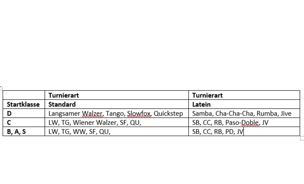 Ab dem Januar 2026 besteht in der Anzahl der zu zeigenden Tänze. In der D-Klasse werden im Standard zusätzlich der Slowfox und im Latein die Samba getanzt, während in der C-Klasse in beiden Turnierarten bereits alle fünf Tänze präsentiert werden.