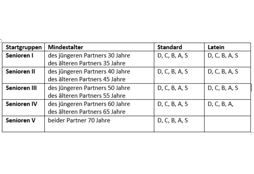 Für alle spät ins Turnier gestarteten Latein-Tänzer wird es in der Altersgruppe Senioren IV die neuen Klassen D – A geben. Ebenso ist für die älteren Standard-Turnier-Tänzer die Turnierkarriere nicht beendet, wenn sie in die Altersgruppe der Senioren V wechseln müssen, bevor sie die S-Klasse erreicht haben. Zusätzlich zur S-Klasse wird es ihnen ermöglicht auch hier erst mit den Klassen D – A ins Turniergeschehen einzusteigen.