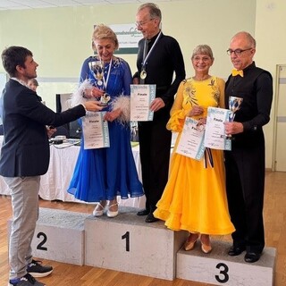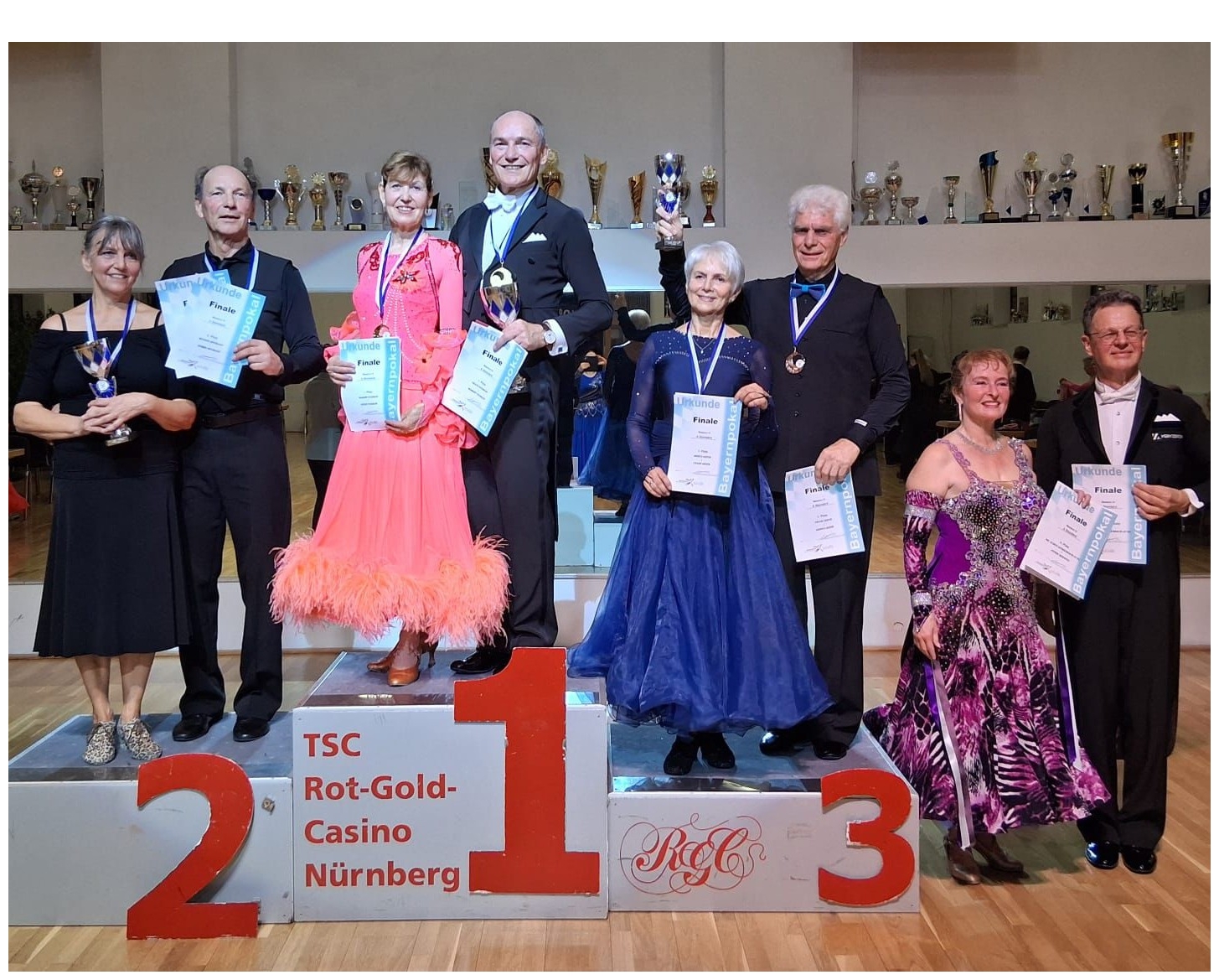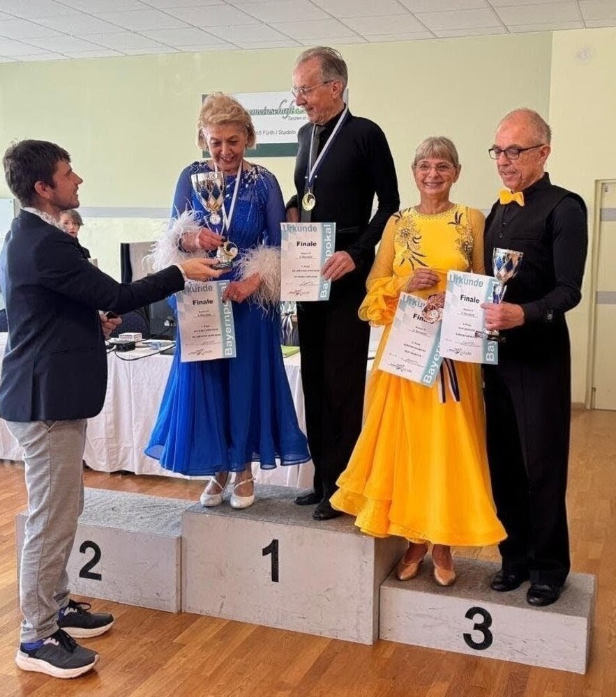 Am Wochenende vom 22. und 23.11.2025 traten in Fürth und Nürnberg die Paare aller Altersklassen an, um die finalen Punkte für die Turnierserie des Bayernpokals zu ergattern. Vermutlich war die Beteiligung aufgrund der abschreckenden Wettervorhersage geringer, so dass einige Turniere abgesagt werden mussten. Die TSA Saphir ertanzte sich während der fünf zur Serie gehörenden Turniere den 20. Platz von 50 teilnehmenden Vereinen. Am reisefreudigsten, daher bei fast allen Turnieren am Start und somit stark am Ergebnis beteiligt, waren unsere Paare der Altersgruppe IV Margot und Franz Stadler sowie Barbara und Olaf Grabatin. Da sie auch im Rahmen der Individualwertung auf das Treppchen kamen, dürfen sie sich als TOP-Paare über einen Gutschein zur Teilnahme an einem Exklusiv-Workshop mit Karolis Burneikis und Fabien Lax freuen. Dieses Paar startete Anfang November als deutscher Vizemeister bei der Weltmeisterschaft in Standard im rumänischen Sibiu, wo sie einen hervorragenden 13. Platz belegten.